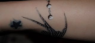 So today I got a new tattoo. My ideal, longed for tattoo. A pretty little bird on my wrist with a thin chain band. Its pearl patterned with black and grey shading.....